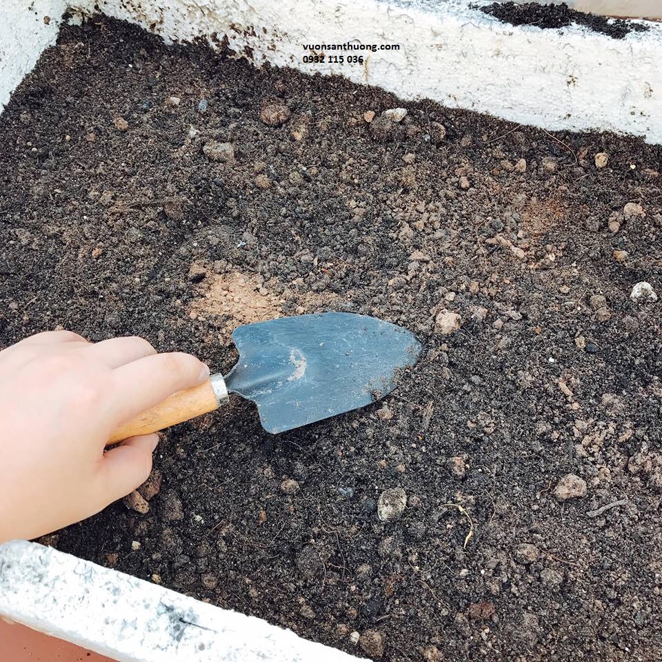 Cho đất đã trộn vào chậu sao cho độ dày đất tối thiểu là 20cm. Tưới ẩm sơ qua. Dùng rơm hoặc giấy báo phủ lên đất. Giữ nguyên đất trong 12 – 15 ngày, giữ giấy hoặc rơm luôn ẩm nhẹ (trong thời gian chờ đợi tiến hành ươm cây con). Sau thời gian trên lấy rơm và giấy báo ra, đảo đều đất 1 lần nữa rồi tiến hàng trồng cây con vào chậu.