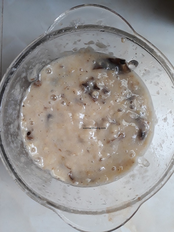 + trộn điều 250ml chế phẩm Em + 500ml rỉ mật+ 9l nước + 1kg chuối xay