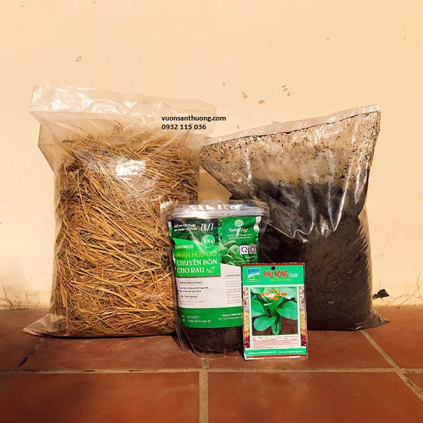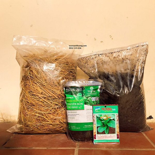 1 chậu chữ nhật kích thước 64x46x12 - 1 bao đất mùn cho rau (10kg)- 1 gói phân bò hữu cơ vi sinh (1kg) - 1 gói hạt giống rau - 1 bao rơm khô(0,5 kg)