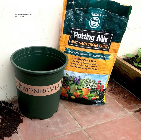 Cho đất thịt vào chậu sao cho độ dày của đất ít nhất là 8-10cm.