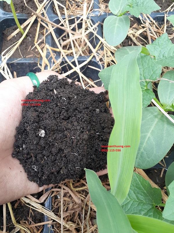 Tận dụng điều đó Vườn sử dụng loại compost tự ủ đã ủ hoai trong suốt 6 tháng để tạo mùn, vừa cung cấp hệ vi sinh vật có lợi cho đất từ phân phân trùn quế tươi. Bên cạnh đó Vườn còn sử dụng trong từng mẻ trộn 1 phần nhỏ trichoderma tăng cường vi sinh vật có lợi giúp phân hủy mùn nhanh và bảo vệ từ nhỏ cây con hữu cơ
