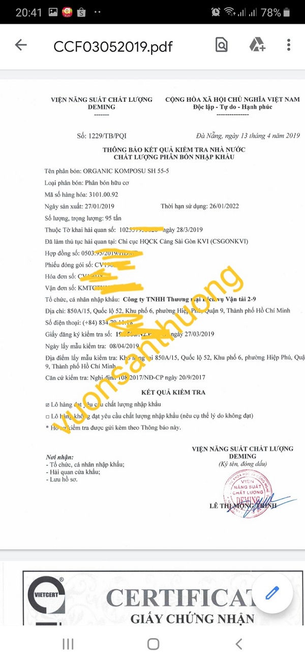 Chất hữu cơ-55%; Tỷ lệ C/N–9.5; pHH2O–6; Độ ẩm<30%; Bổ xung Axit humic, Ca, NPK