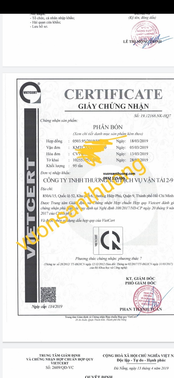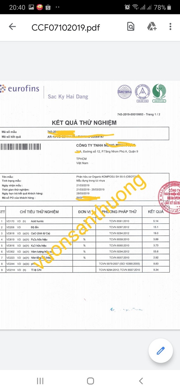 Chất hữu cơ-55%; Tỷ lệ C/N–9.5; pHH2O–6; Độ ẩm<30%; Bổ xung Axit humic, Ca, NPK